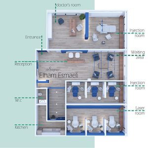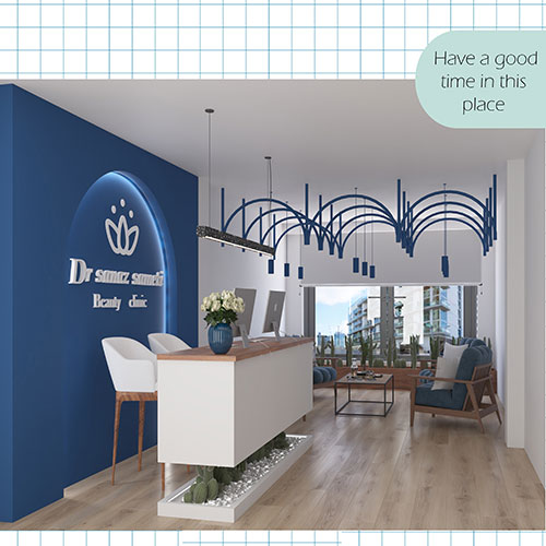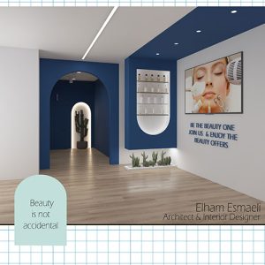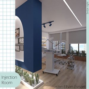 پروژه حاضر شامل فضاهایی همچون اتاق ویزیت پزشک، تزریقات، جوانسازی و لیزر است که تقریبا همه فعالیت ها و خدمات پوست، مو و زیبایی در این کلینیک صورت می پذیرد. همچنین بخشی را به عنوان فروش محصولات آرایشی و زیبایی در این مکان طراحی نمودیم تا تهیه محصولات برای مراجعین را در این فضا تسهیل نماییم.