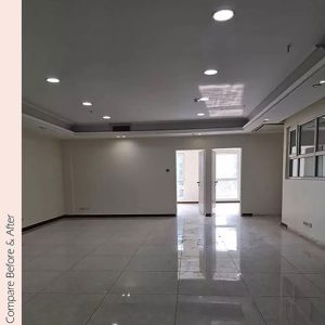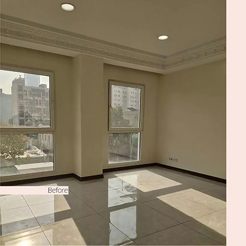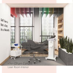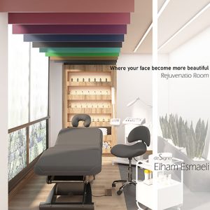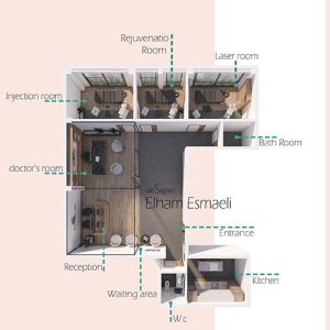 در پروژه حاضر به دلیل کمبود فضا از پتانسیل فضای پذیرائی استفاده نمودیم و بخش ویزیت پزشک را در این قسمت تعبیه کردیم. از طرفی ورودی اتاق تزریقات(ژل، بوتاکس و …) در قسمت ویزیت پزشک تعبیه شد تا تزریقاتی که توسط شخص خود پزشک انجام میگیرد تحت نظر خودش صورت پذیرد.